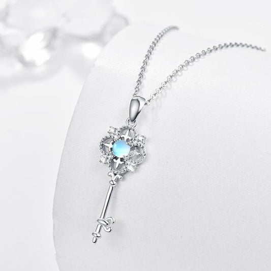 Sterling Silver Key Blue Moonstone and AAA Cz Round Key Pendant Necklace